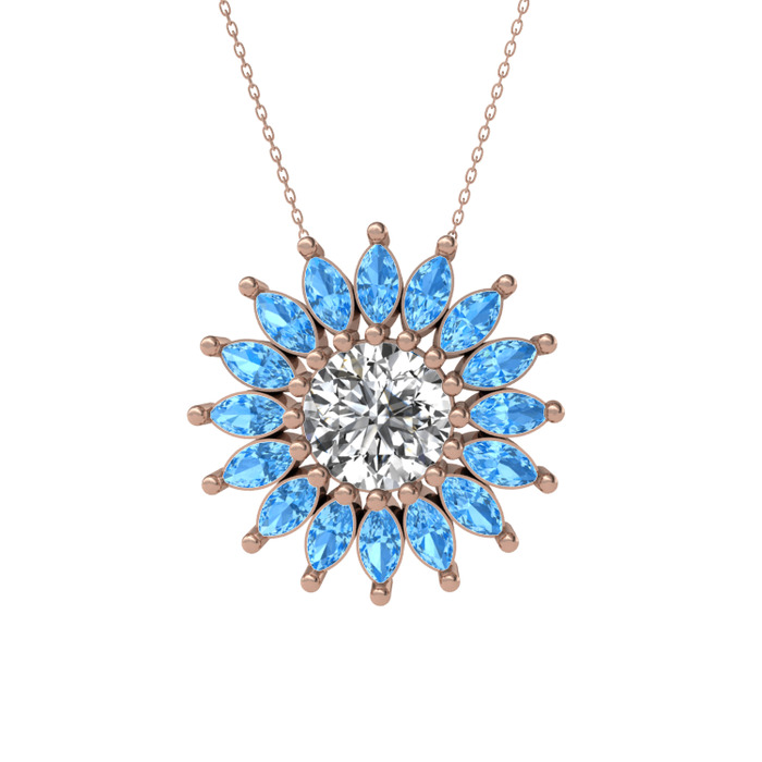 Swarovski ve akuamarin 925 ayar rose altın kaplama gümüş kolye (40 cm rose altın rolo zincir)