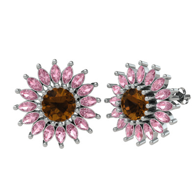 Dumanlı kuvars ve pembe kuvars 18 ayar beyaz altın küpe