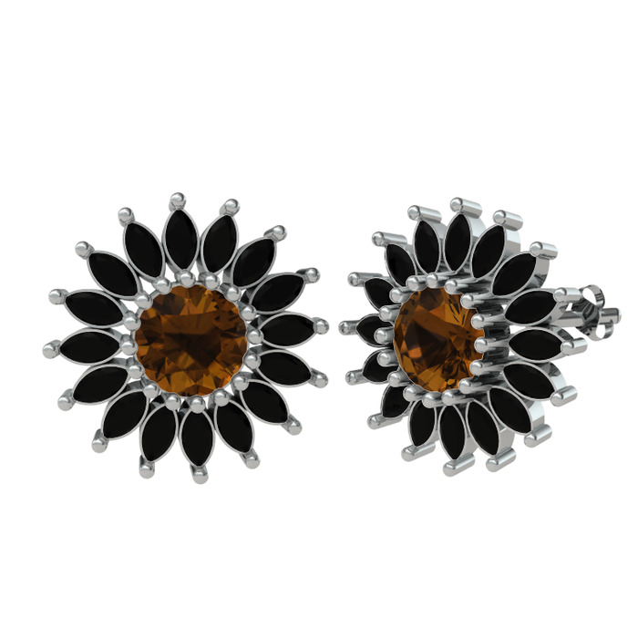 Dumanlı kuvars ve siyah zirkon 14 ayar beyaz altın küpe