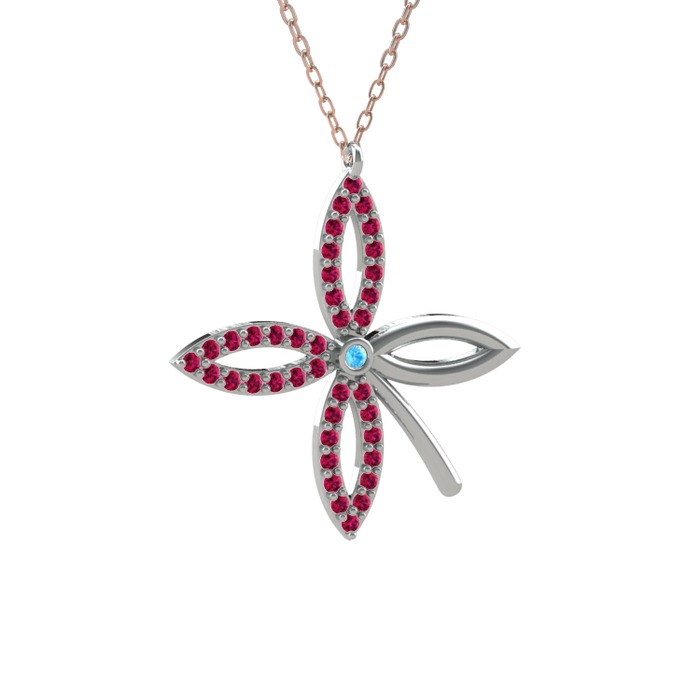 Akuamarin ve rodolit garnet 18 ayar beyaz altın kolye (40 cm rose altın rolo zincir)