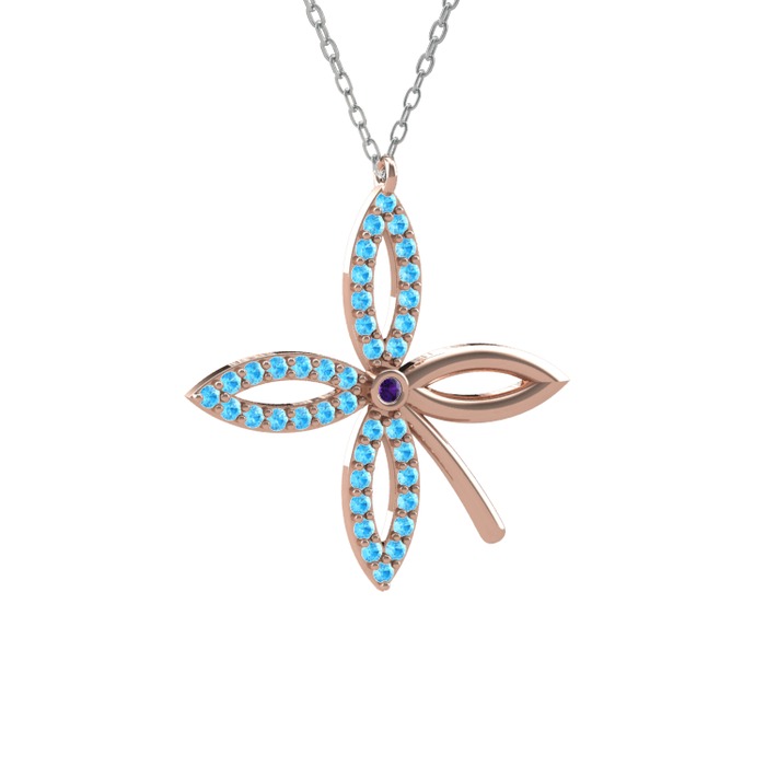 Ametist ve akuamarin 925 ayar rose altın kaplama gümüş kolye (40 cm beyaz altın rolo zincir)