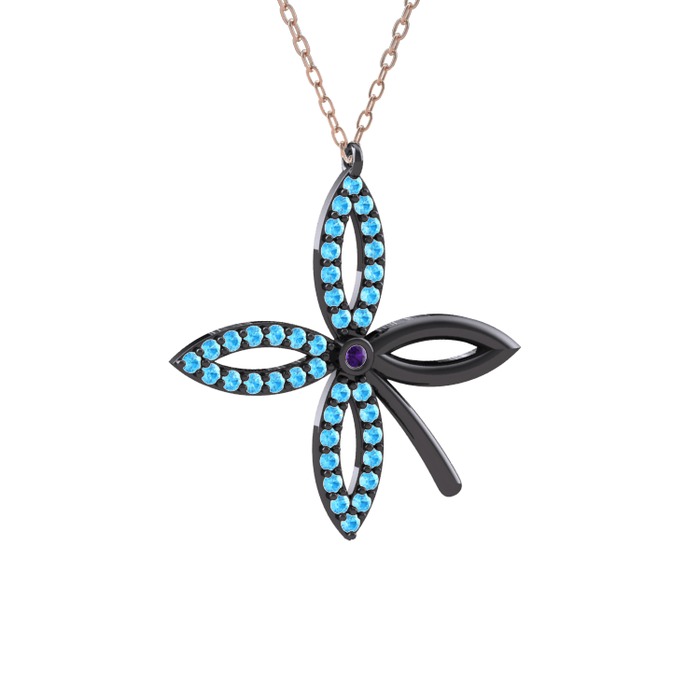 Ametist ve akuamarin 925 ayar siyah rodyum kaplama gümüş kolye (40 cm rose altın rolo zincir)