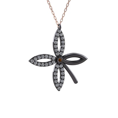 Dumanlı kuvars ve pırlanta 925 ayar siyah rodyum kaplama gümüş kolye (0.429 karat, 40 cm rose altın rolo zincir)
