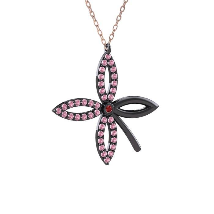 Garnet ve pembe kuvars 925 ayar siyah rodyum kaplama gümüş kolye (40 cm rose altın rolo zincir)