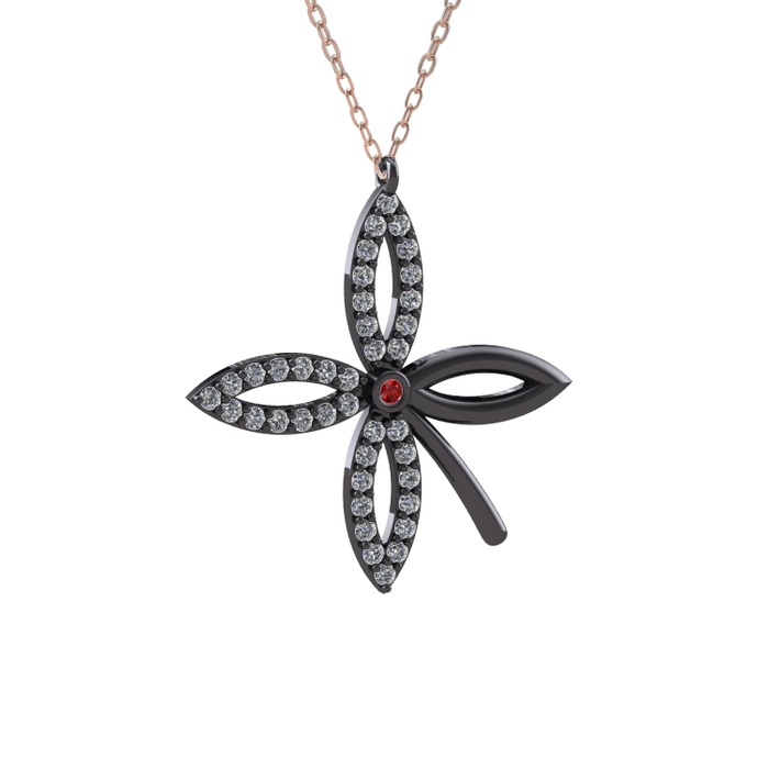 Garnet ve pırlanta 925 ayar siyah rodyum kaplama gümüş kolye (0.429 karat, 40 cm rose altın rolo zincir)