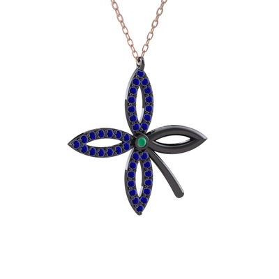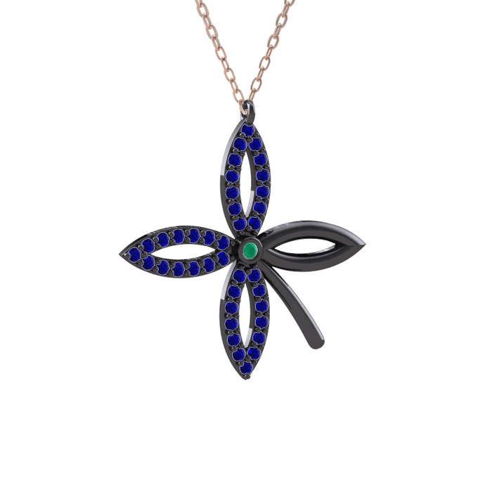 Kök zümrüt ve lab safir 925 ayar siyah rodyum kaplama gümüş kolye (40 cm rose altın rolo zincir)