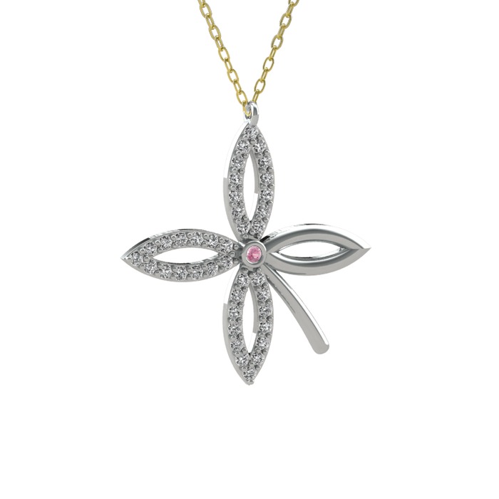 Pembe kuvars ve beyaz zirkon 18 ayar beyaz altın kolye (40 cm altın rolo zincir)
