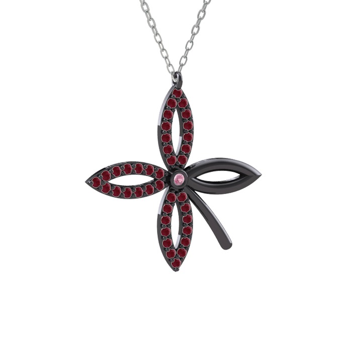 Pembe kuvars ve kök yakut 925 ayar siyah rodyum kaplama gümüş kolye (40 cm beyaz altın rolo zincir)