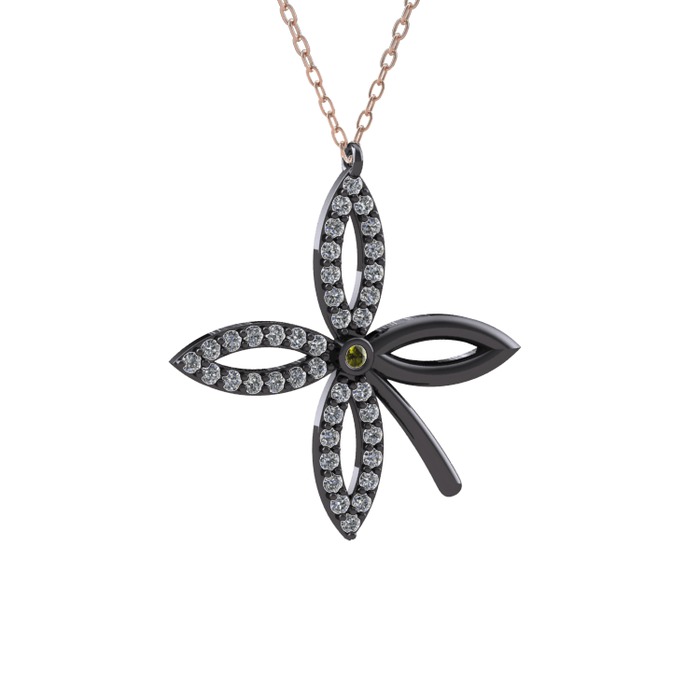 Peridot ve pırlanta 925 ayar siyah rodyum kaplama gümüş kolye (0.429 karat, 40 cm rose altın rolo zincir)