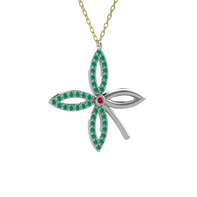 Rodolit garnet ve kök zümrüt 18 ayar beyaz altın kolye (40 cm altın rolo zincir)