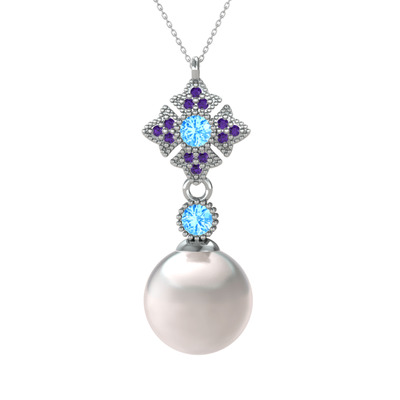Inci, akuamarin ve ametist 8 ayar beyaz altın kolye (40 cm beyaz altın rolo zincir)