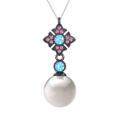 Inci, akuamarin ve pembe kuvars 925 ayar siyah rodyum kaplama gümüş kolye (40 cm beyaz altın rolo zincir)