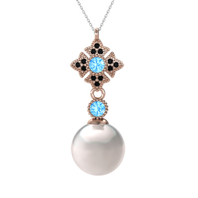 Inci, akuamarin ve siyah zirkon 14 ayar rose altın kolye (40 cm beyaz altın rolo zincir)