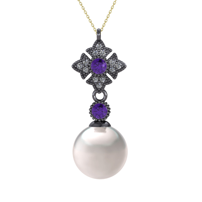 Inci, ametist ve pırlanta 925 ayar siyah rodyum kaplama gümüş kolye (0.1056 karat, 40 cm altın rolo zincir)