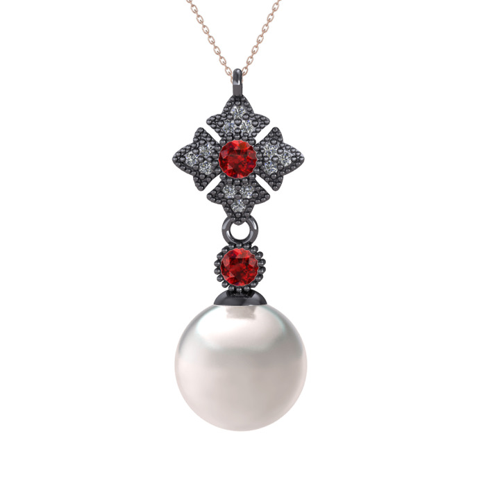 Inci, garnet ve pırlanta 925 ayar siyah rodyum kaplama gümüş kolye (0.1056 karat, 40 cm gümüş rolo zincir)