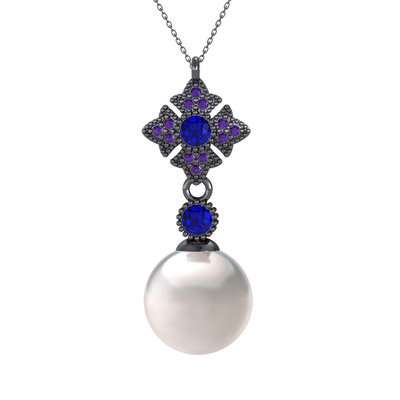 Inci, lab safir ve ametist 925 ayar siyah rodyum kaplama gümüş kolye (40 cm gümüş rolo zincir)