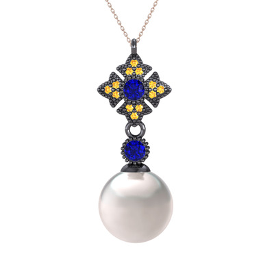 Inci, lab safir ve sitrin 925 ayar siyah rodyum kaplama gümüş kolye (40 cm gümüş rolo zincir)