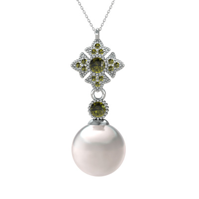 Inci ve peridot 8 ayar beyaz altın kolye (40 cm gümüş rolo zincir)