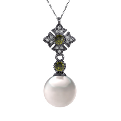 Inci, peridot ve beyaz zirkon 925 ayar siyah rodyum kaplama gümüş kolye (40 cm gümüş rolo zincir)
