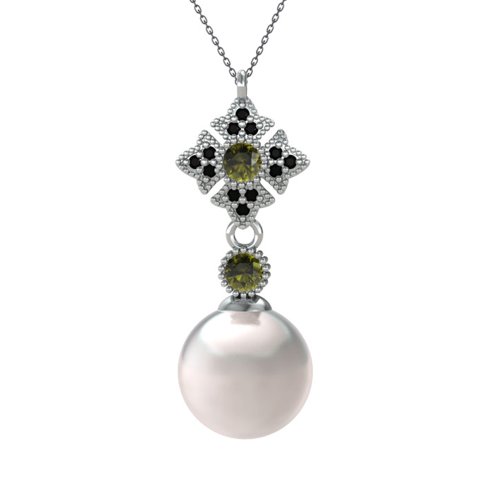 Inci, peridot ve siyah zirkon 14 ayar beyaz altın kolye (40 cm gümüş rolo zincir)