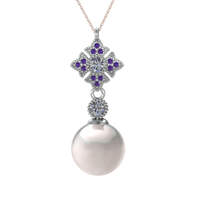 Inci, pırlanta ve ametist 14 ayar beyaz altın kolye (0.22 karat, 40 cm rose altın rolo zincir)