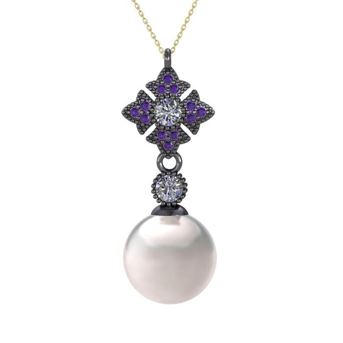 Inci, pırlanta ve ametist 925 ayar siyah rodyum kaplama gümüş kolye (0.22 karat, 40 cm gümüş rolo zincir)