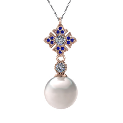 Inci, pırlanta ve lab safir 8 ayar rose altın kolye (0.22 karat, 40 cm gümüş rolo zincir)