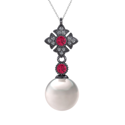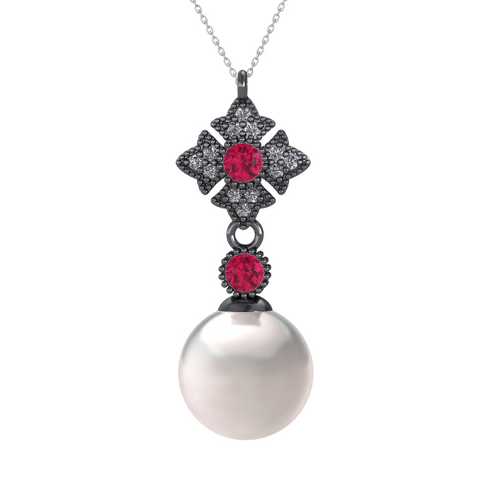 Inci, rodolit garnet ve pırlanta 925 ayar siyah rodyum kaplama gümüş kolye (0.1056 karat, 40 cm beyaz altın rolo zincir)