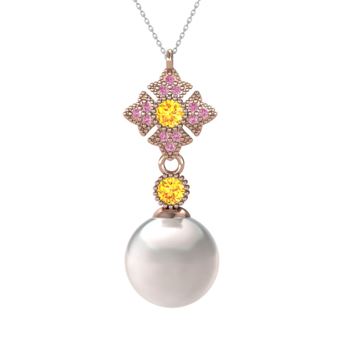 Inci, sitrin ve pembe kuvars 14 ayar rose altın kolye (40 cm beyaz altın rolo zincir)