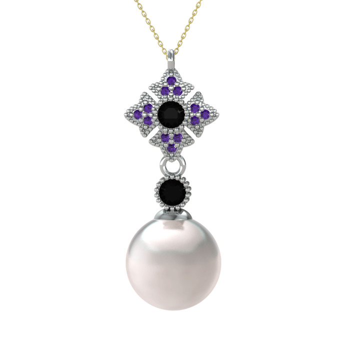 Inci, siyah zirkon ve ametist 8 ayar beyaz altın kolye (40 cm altın rolo zincir)