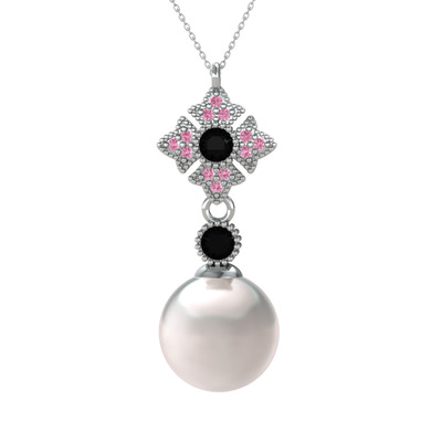 Inci, siyah zirkon ve pembe kuvars 8 ayar beyaz altın kolye (40 cm gümüş rolo zincir)