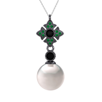 Inci, siyah zirkon ve yeşil kuvars 925 ayar siyah rodyum kaplama gümüş kolye (40 cm beyaz altın rolo zincir)