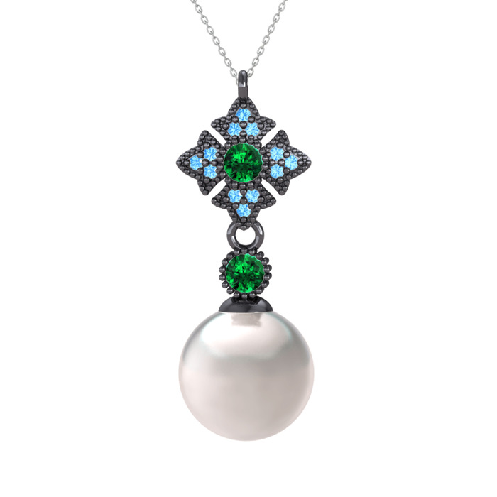 Inci, yeşil kuvars ve akuamarin 925 ayar siyah rodyum kaplama gümüş kolye (40 cm beyaz altın rolo zincir)