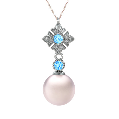 Pembe inci, akuamarin ve beyaz zirkon 14 ayar beyaz altın kolye (40 cm rose altın rolo zincir)