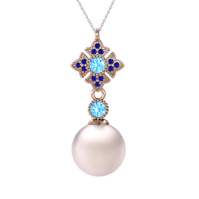 Pembe inci, akuamarin ve lab safir 8 ayar rose altın kolye (40 cm gümüş rolo zincir)