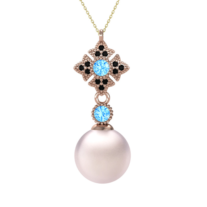 Pembe inci, akuamarin ve siyah zirkon 14 ayar rose altın kolye (40 cm gümüş rolo zincir)