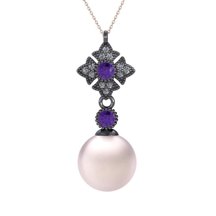 Pembe inci, ametist ve pırlanta 925 ayar siyah rodyum kaplama gümüş kolye (0.1056 karat, 40 cm rose altın rolo zincir)