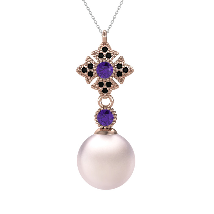 Pembe inci, ametist ve siyah zirkon 14 ayar rose altın kolye (40 cm beyaz altın rolo zincir)