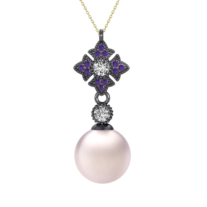 Pembe inci, beyaz zirkon ve ametist 925 ayar siyah rodyum kaplama gümüş kolye (40 cm altın rolo zincir)