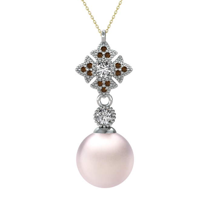 Pembe inci, beyaz zirkon ve dumanlı kuvars 14 ayar beyaz altın kolye (40 cm altın rolo zincir)