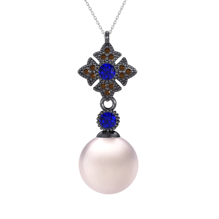 Pembe inci, lab safir ve dumanlı kuvars 925 ayar siyah rodyum kaplama gümüş kolye (40 cm gümüş rolo zincir)