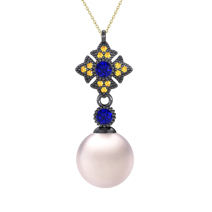 Pembe inci, lab safir ve sitrin 925 ayar siyah rodyum kaplama gümüş kolye (40 cm altın rolo zincir)
