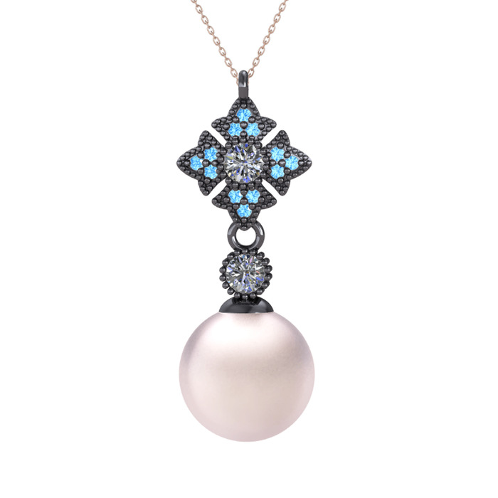 Pembe inci, pırlanta ve akuamarin 925 ayar siyah rodyum kaplama gümüş kolye (0.22 karat, 40 cm gümüş rolo zincir)