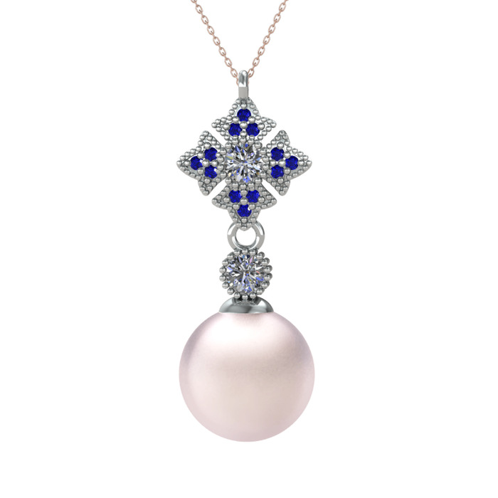Pembe inci, pırlanta ve lab safir 14 ayar beyaz altın kolye (0.22 karat, 40 cm rose altın rolo zincir)
