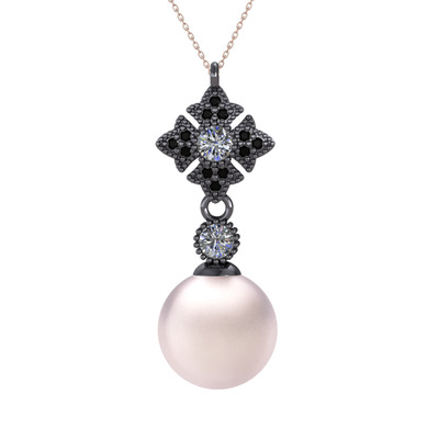 Pembe inci, pırlanta ve siyah zirkon 925 ayar siyah rodyum kaplama gümüş kolye (0.22 karat, 40 cm rose altın rolo zincir)