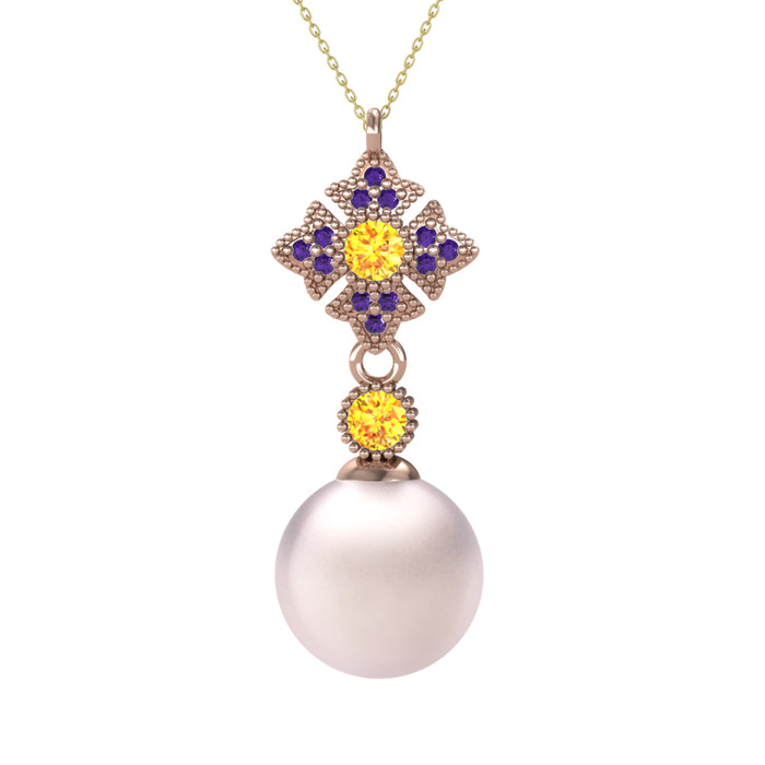 Pembe inci, sitrin ve ametist 14 ayar rose altın kolye (40 cm altın rolo zincir)