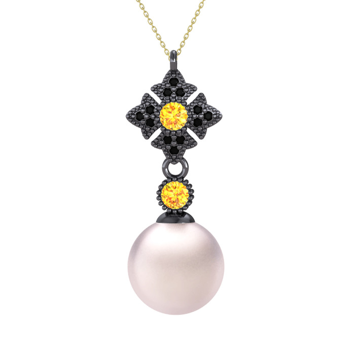 Pembe inci, sitrin ve siyah zirkon 925 ayar siyah rodyum kaplama gümüş kolye (40 cm altın rolo zincir)