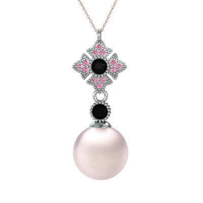 Pembe inci, siyah zirkon ve pembe kuvars 8 ayar beyaz altın kolye (40 cm rose altın rolo zincir)