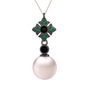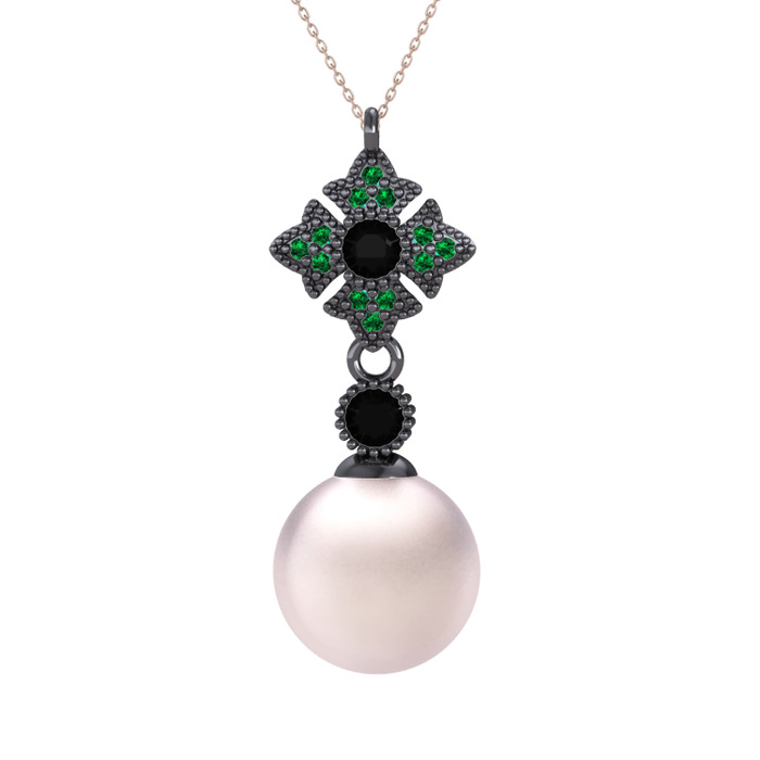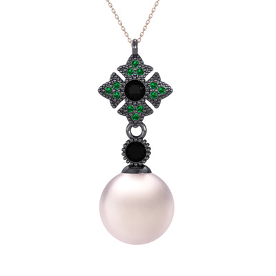 Pembe inci, siyah zirkon ve yeşil kuvars 925 ayar siyah rodyum kaplama gümüş kolye (40 cm rose altın rolo zincir)