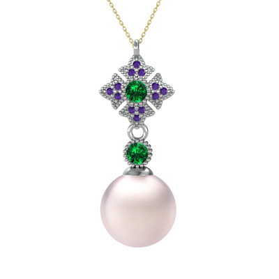 Pembe inci, yeşil kuvars ve ametist 8 ayar beyaz altın kolye (40 cm altın rolo zincir)